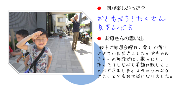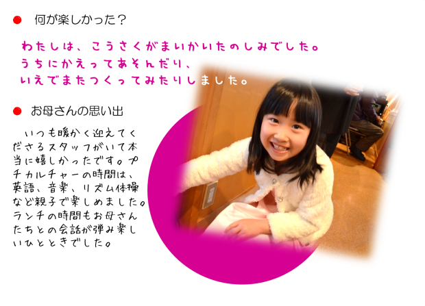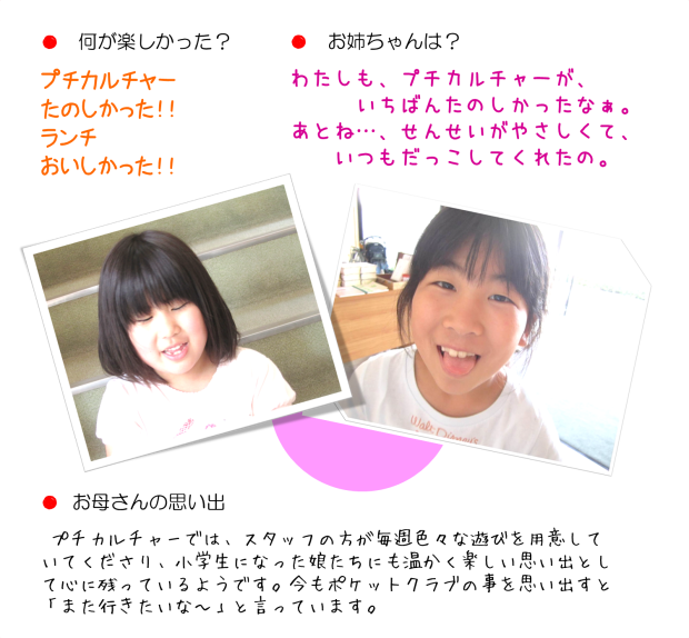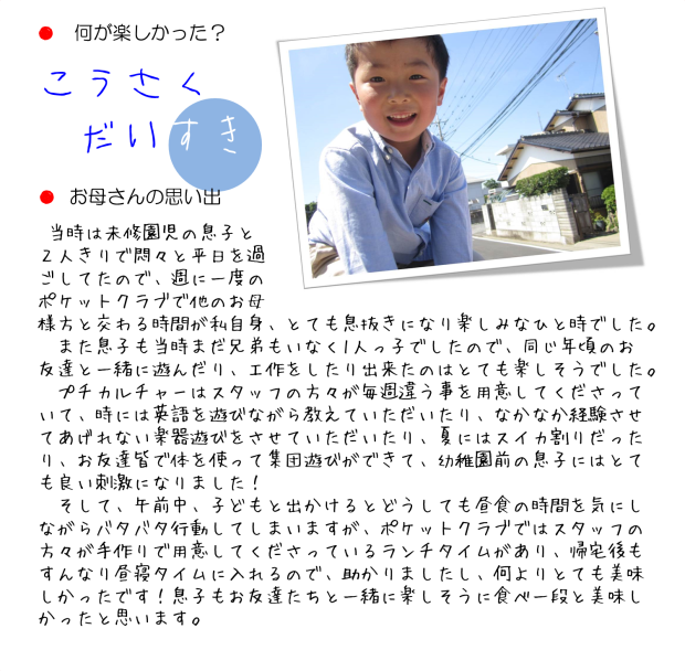 これまで、たくさんのお友だちがポケットクラブを卒業していきました。みんな、今は、市内の幼稚園や小学校でスクスクと成長しているようです。 今日は、ポケットクラブのホームページが作成されることを耳にして、お友だちがポケットクラブで楽しかったことについて、お話をしてくれました。またお母さんも、ポケットクラブでの思い出を語ってくださいました。 みなさん、ありがとうございます。これから毎月、少しずつ紹介させていただきます。